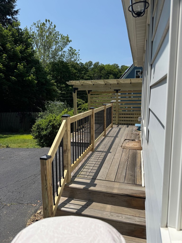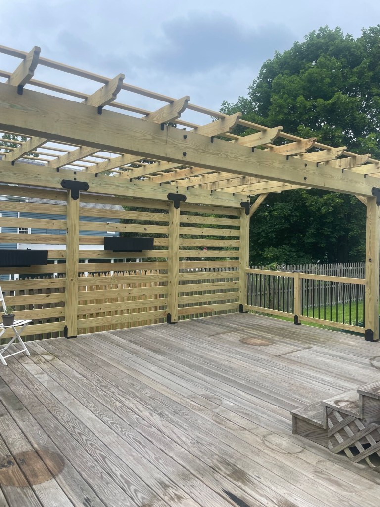 The original deck at the back of the property felt exposed to the neighbor’s home. It also felt exposed to the sunny summer days. My clients wanted more privacy and a reprieve from the sun. We decided on a pergola with a privacy screen to be constructed on the existing deck. We engaged our architect to verify the soundness of the pre-existing structure. They ensured that all building codes were considered in the design phase.