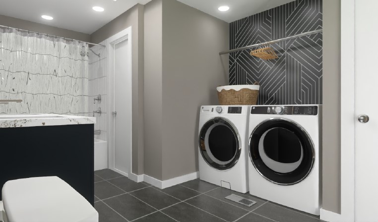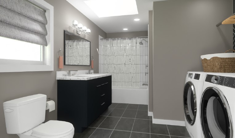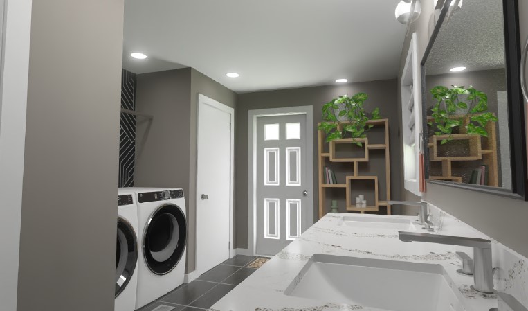 The design removed the tub deck and constructed a closet to create an alcove for the laundry units. The plan was to remove a soffit above the jetted tub. It also involved removing a built-in cabinet that was in the current layout. We were to update the exterior door and storm door to help with the space maintaining heat. The exterior walls were cement block. Until we opened up the walls, we could only guess at their construction.