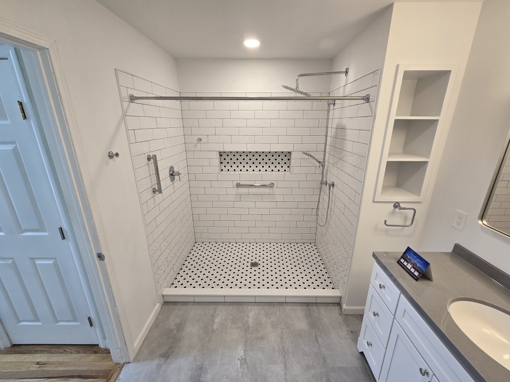Besides being just a fantastic human being, my client has a very solid design style she wants to incorporate. Big dreams can quickly lead to a larger budget than a Homeowner is willing to invest. A lean towards higher end taste and a larger footprint can also contribute to this – especially in a bathroom. We did have to scale back to meet her budget. The glass was one of the larger investments for the project. One compromise was to wait on the glass panel, but to prepare the space for the future addition of one. This means that we put in blocking behind the tile. This allows a panel to be easily installed any time after construction. In the meantime, we will install a curtain and rod for her.