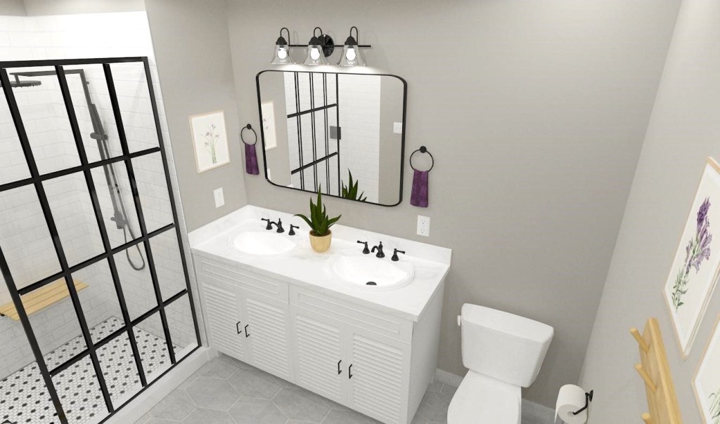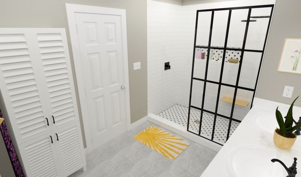 My initial design removed the tub and the corner shower unit. To assist in storage needs we placed a freestanding linen cabinet where the shower unit once stood. My client loved the idea of black finishes. She fell in love with a black and white hex tile for the shower floor. She also wanted to have a folding wall bench seat for the new shower area.