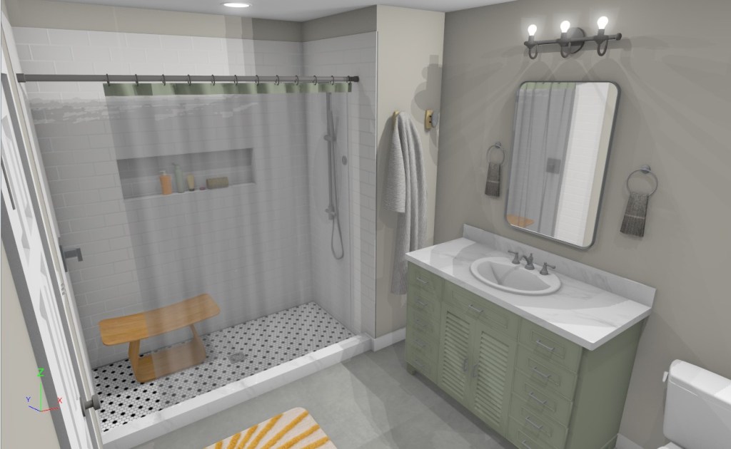 Sometimes seeing the changes we are suggesting opens up new thoughts. We took out the folding bench in favor of getting a bench that is movable. She also wanted to see the sage green vanity in the space. She wanted to remove the accent tile from the wall niche. This helped her make some decisions. We also realized the downsizing of the vanity would allow for her to place robe/towel hooks on the wall.