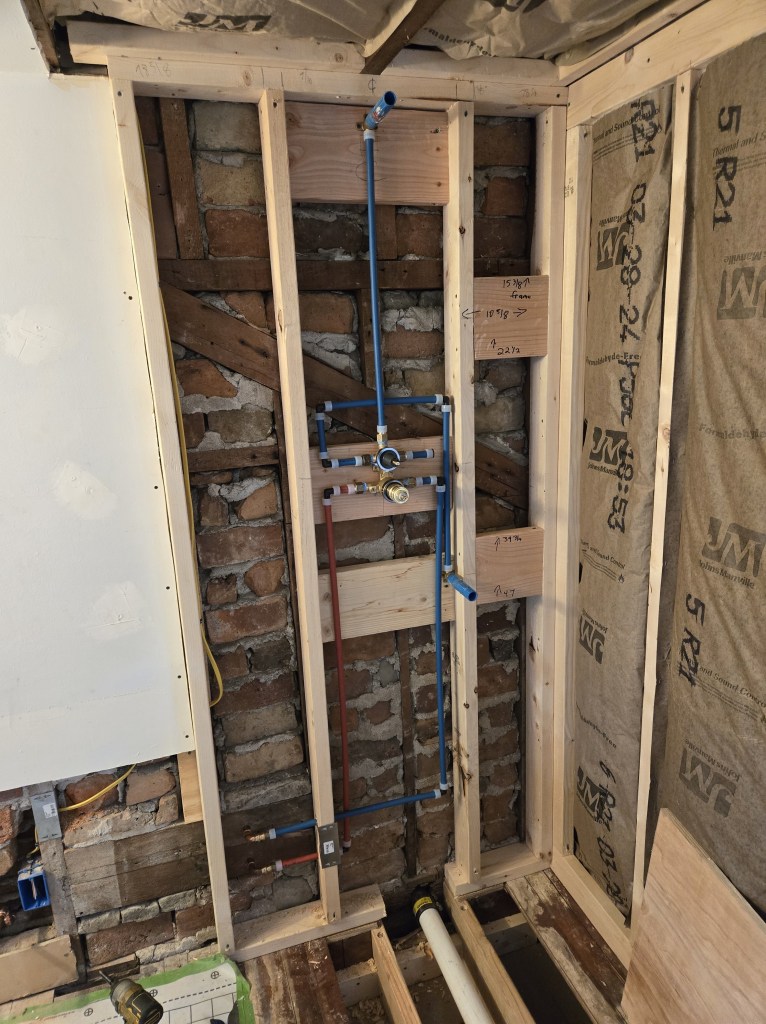 Sometimes the best plans go awry when you literally hit a brick wall. We had plans to put in plumbing here and we had to course correct. We ended up packing out the wall and lost a small amount of space. In the end, we managed to keep momentum.