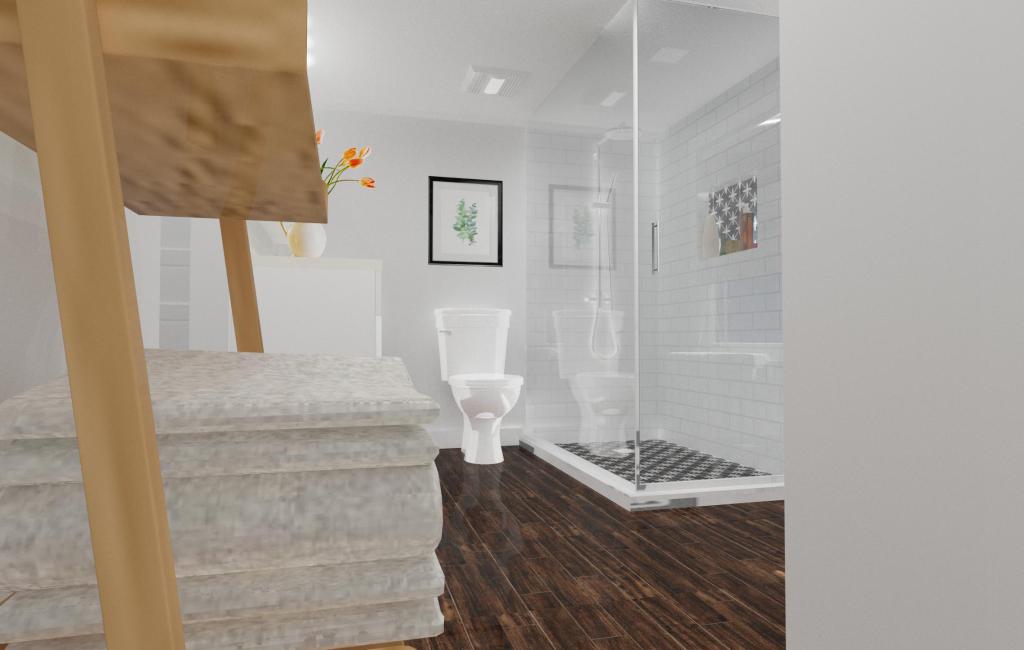 We wanted to eliminate the cramped feeling and lack of light. So, we decided to ditch the solid walls. Instead, we opted for a glass enclosure. This meant moving the plumbing from the interior partition wall to the back wall. Adding in a wall niche at the exterior wall