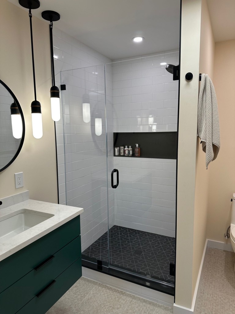 The new bathroom looks amazing. This was once a dreary basement and now it feels like it belongs in her home. My client’s modern style shines through along with her fun energy. I’m excited for more final pictures … stay tuned!!
