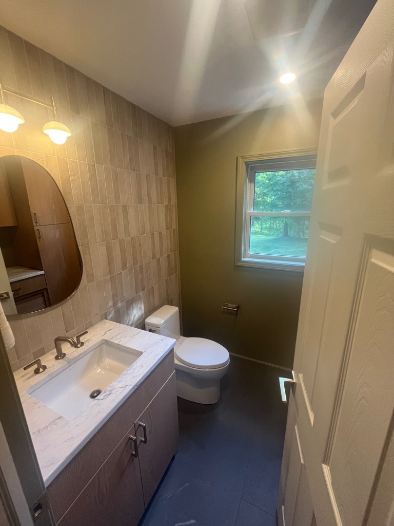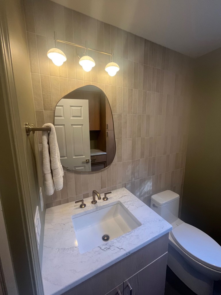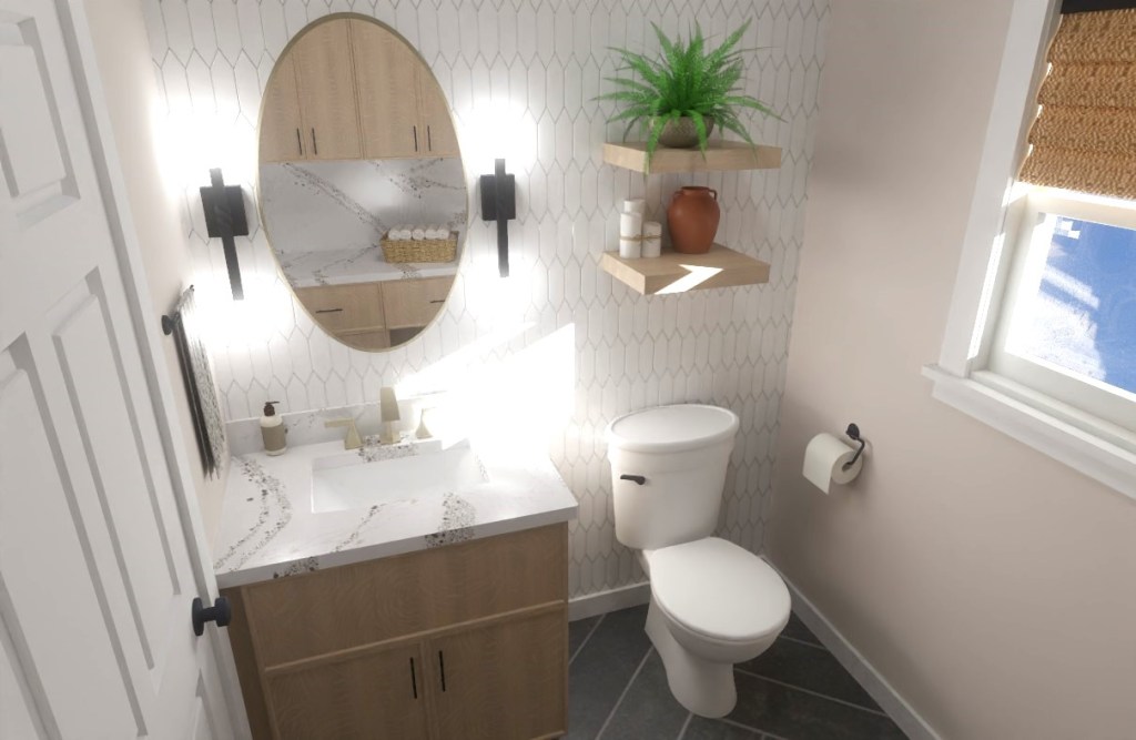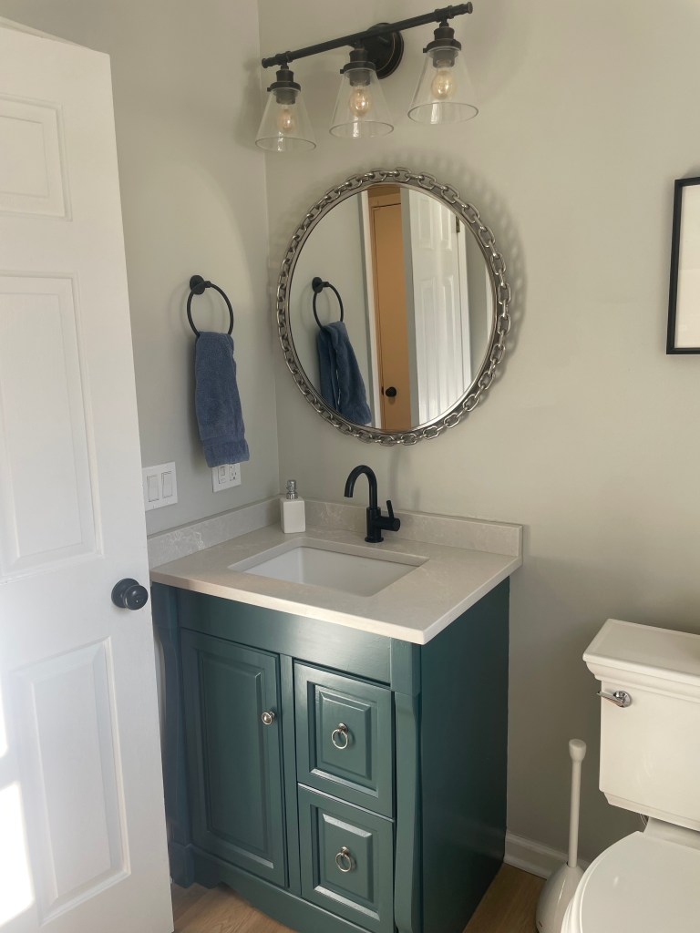 My clients had a smallish powder room on their first floor that guests use when they entertain. While the original space wasn’t terribly outdated, it wasn’t what they wanted. They also have cats. They were looking for a solution to hide the kitty litter from guests when they arrive.