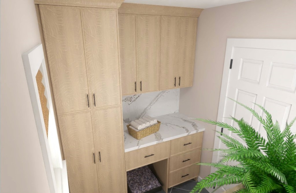 Adding cabinetry was a simple way to hide storage items necessary for the kitties. My original idea was to create a cubby under a countertop area. This would allow for the kitty litter. My clients also saw this as a possible changing table area. Ultimately the design evolved and the cabinets became