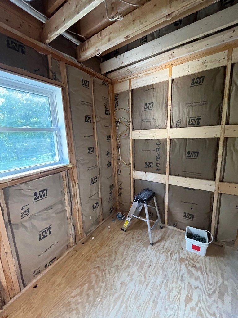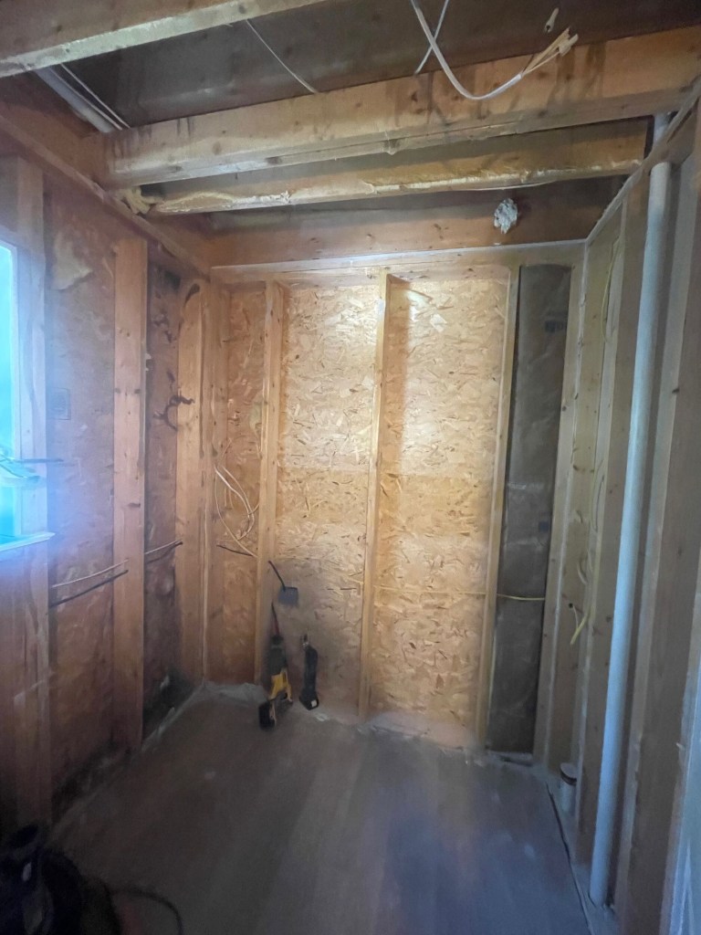 We closed up the dryer vent and re-insulated the walls. Blocking was installed for the cabinetry.