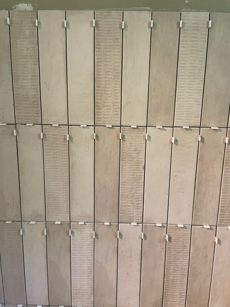 The tile is beautiful and has a handmade feel with color variation. A textured deco tile is mixed within to create visual interest. My clients also chose a grout color to match the tile to create a subtle look that feels understated.