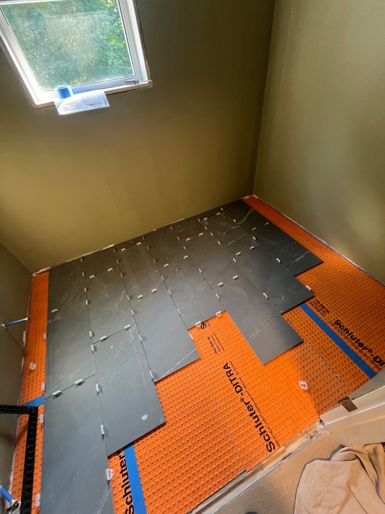Once sheetrock was hung and taped, we arranged for a first coat of paint. The floor tile is installed over an uncoupling membrane to ensure the subfloor is protected.