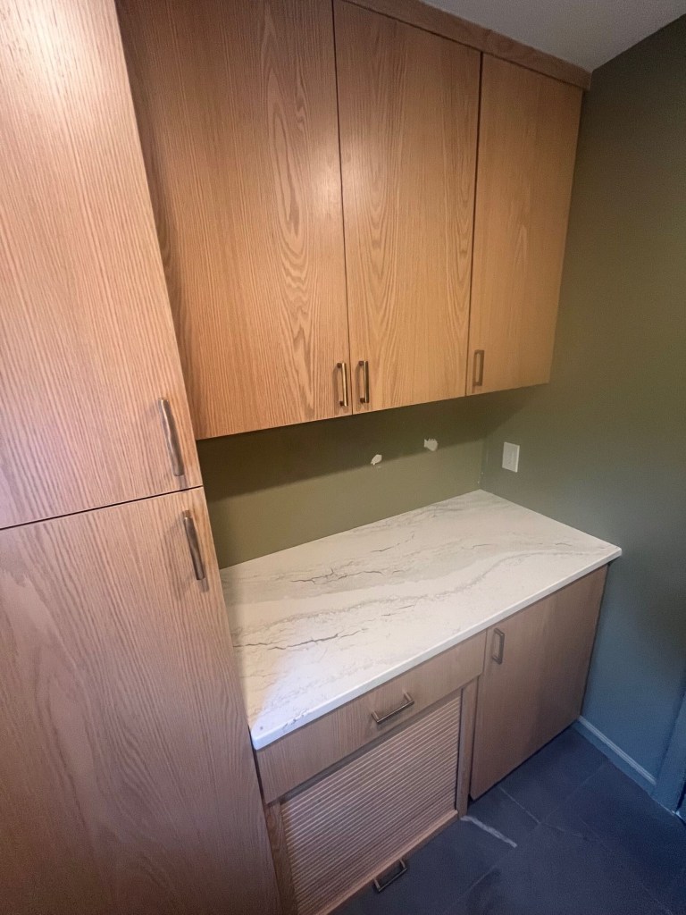 A tambour door gives them the option to hide away the kitty litter when entertaining. They can have it open for daily living. This project is almost complete – Stay tuned for final photos!