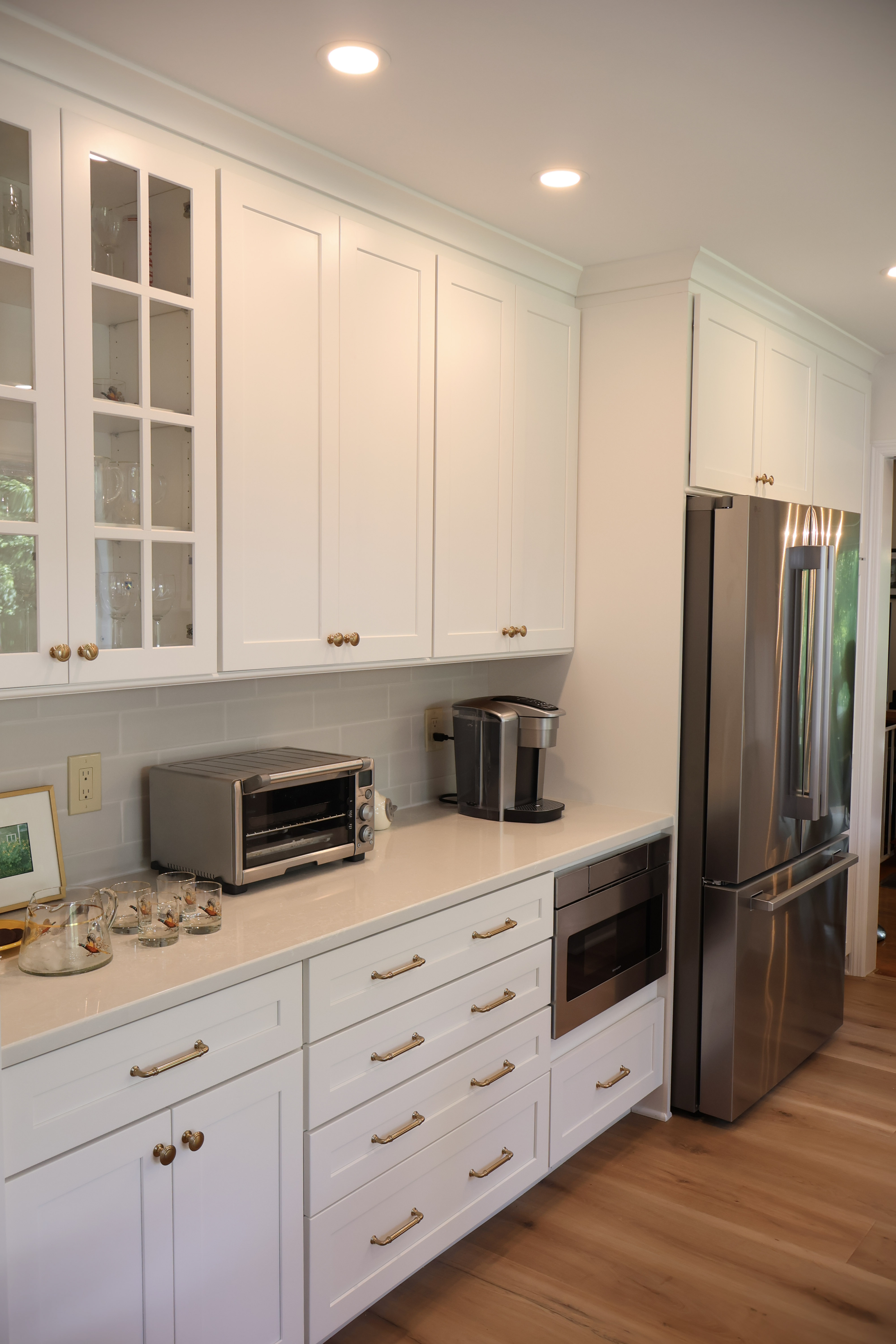 After some discussion, we put in a pocket door. We also eliminated the soffits above the cabinets to take everything up to the ceiling. The Homeowners hated the microwave vent hood and wanted a new range hood. They decided on an appliance garage with the idea of housing a rogue appliance. Alternatively, they can use this as a bread box. It’s a fun idea if you bake goodies but want clean counters.