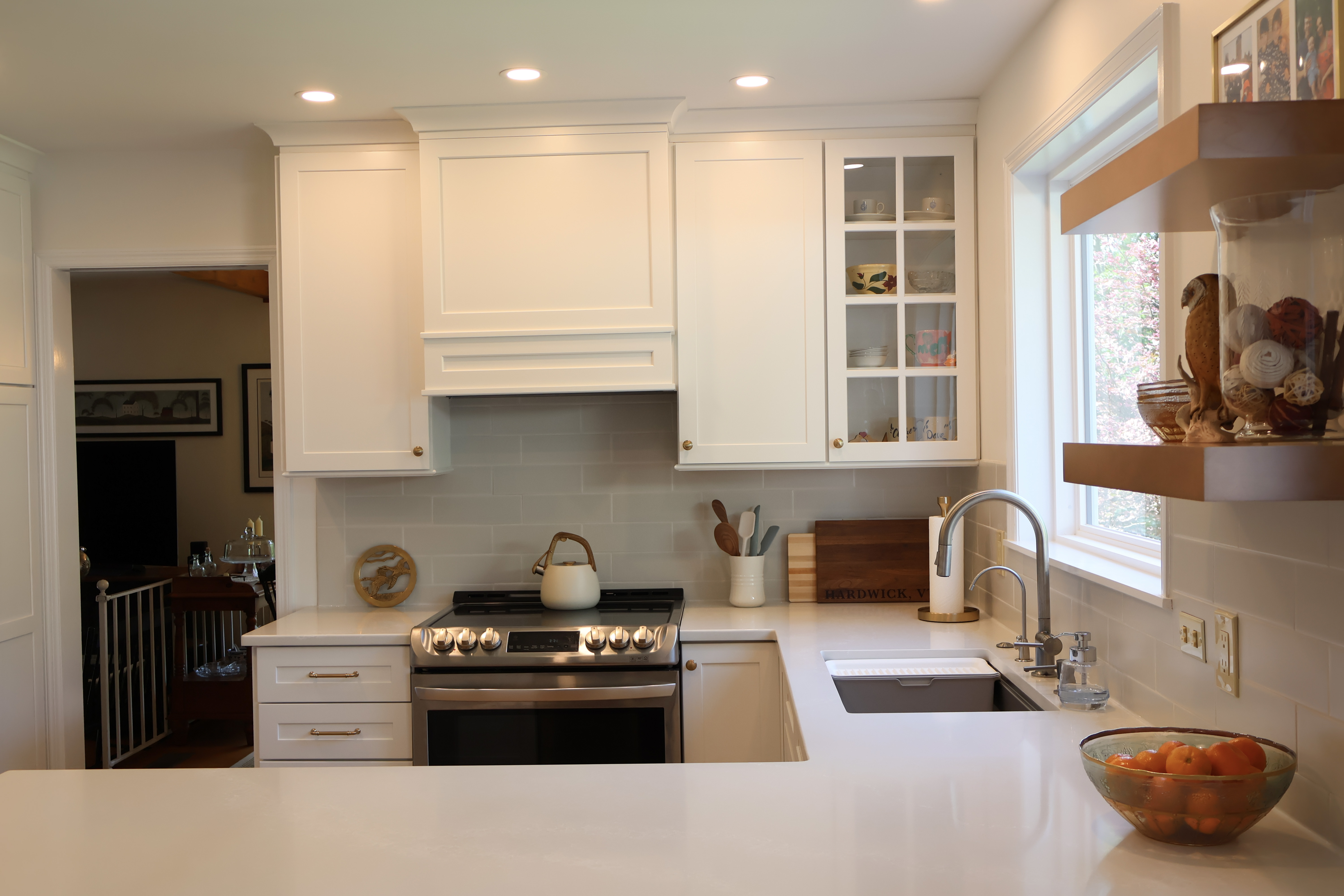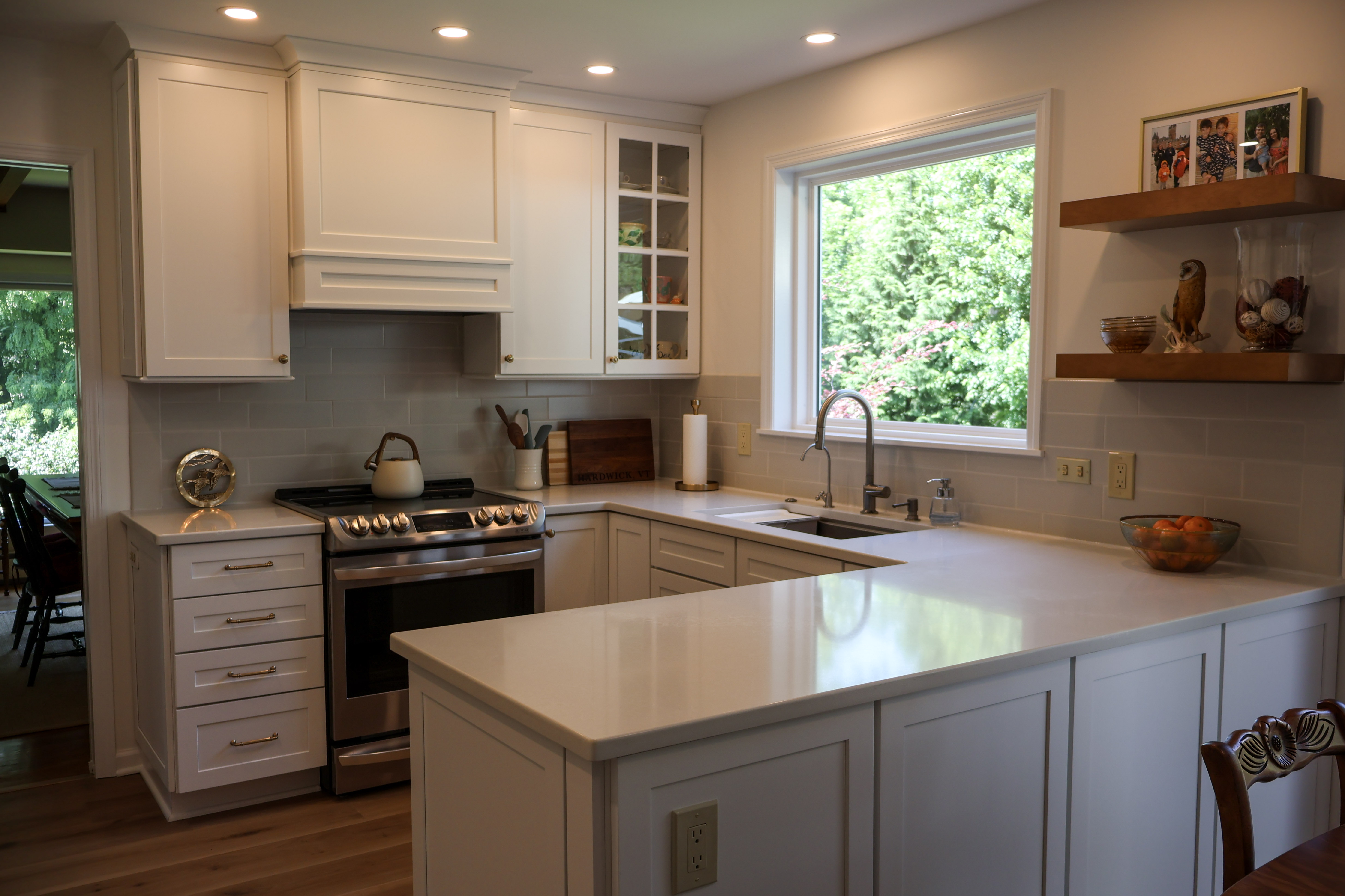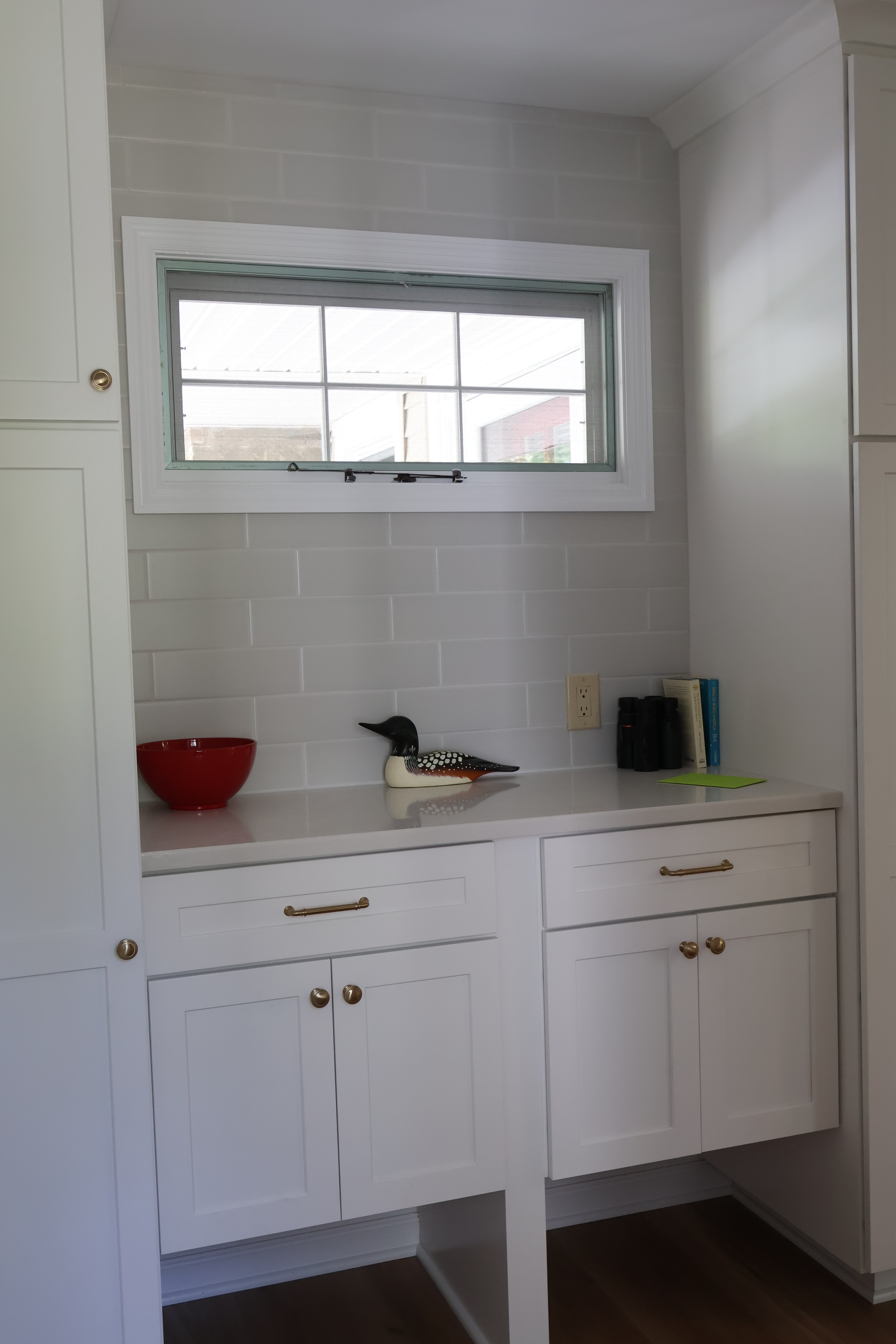 We debated at the new larger picture window and sacrificed cabinetry for the view. Instead, we opted for some floating shelves to display her prettier serving pieces. We carried the tile around the perimeter of the window to highlight the view. This also gives a finished feel. It is very beautiful in my opinion.