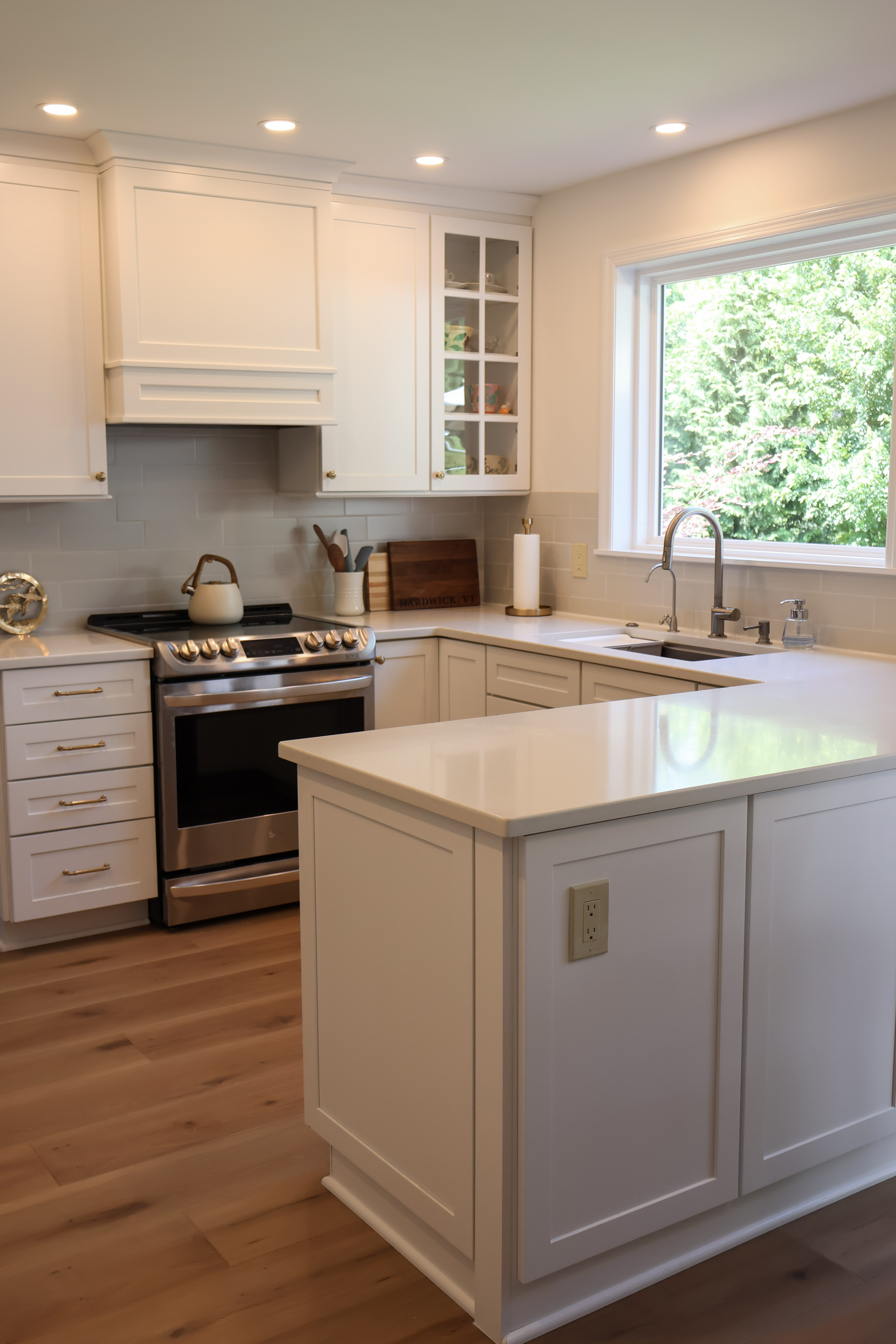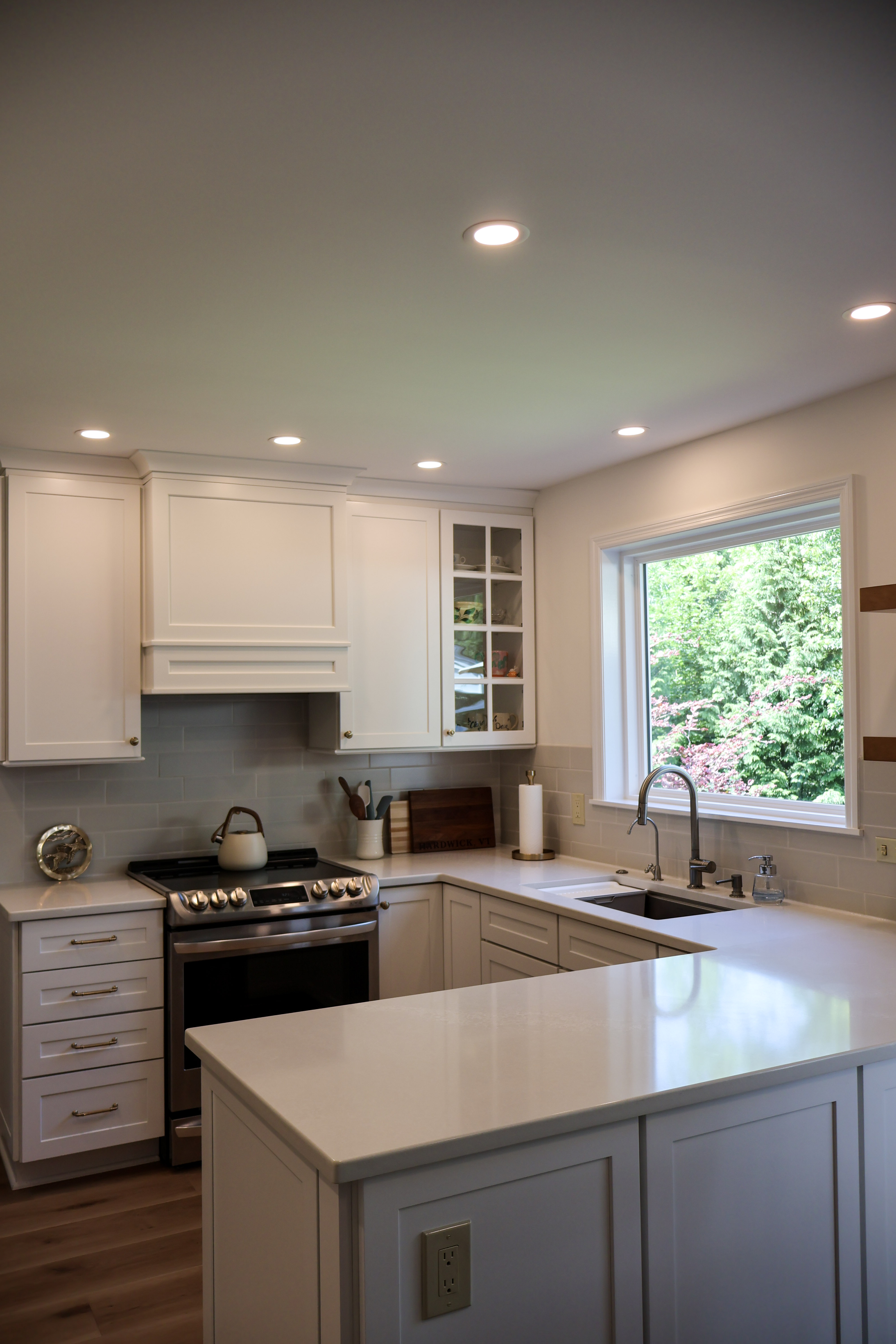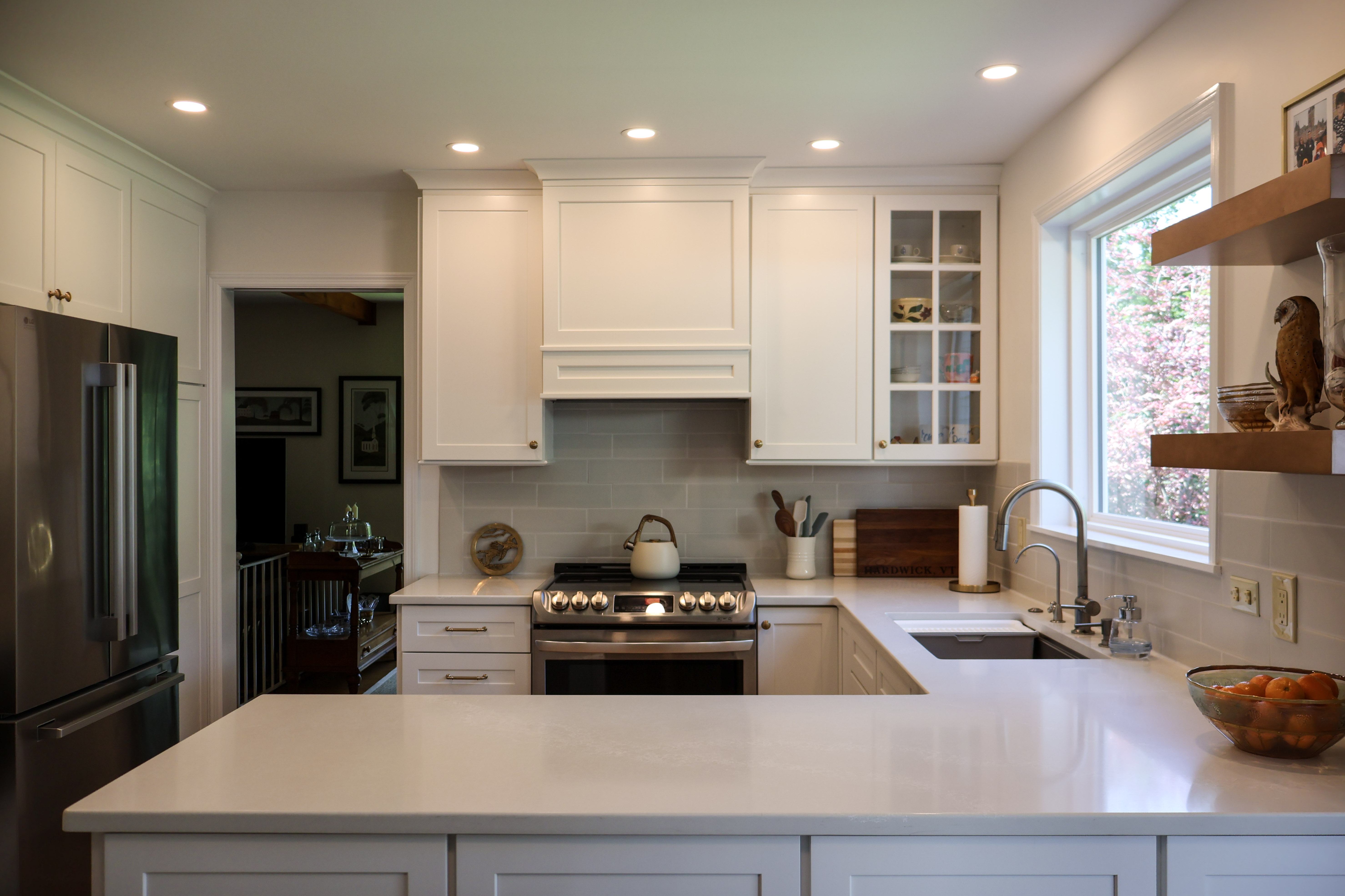 We debated at the new larger picture window and sacrificed cabinetry for the view. Instead, we opted for some floating shelves to display her prettier serving pieces. We carried the tile around the perimeter of the window to highlight the view. This also gives a finished feel. It is very beautiful in my opinion.