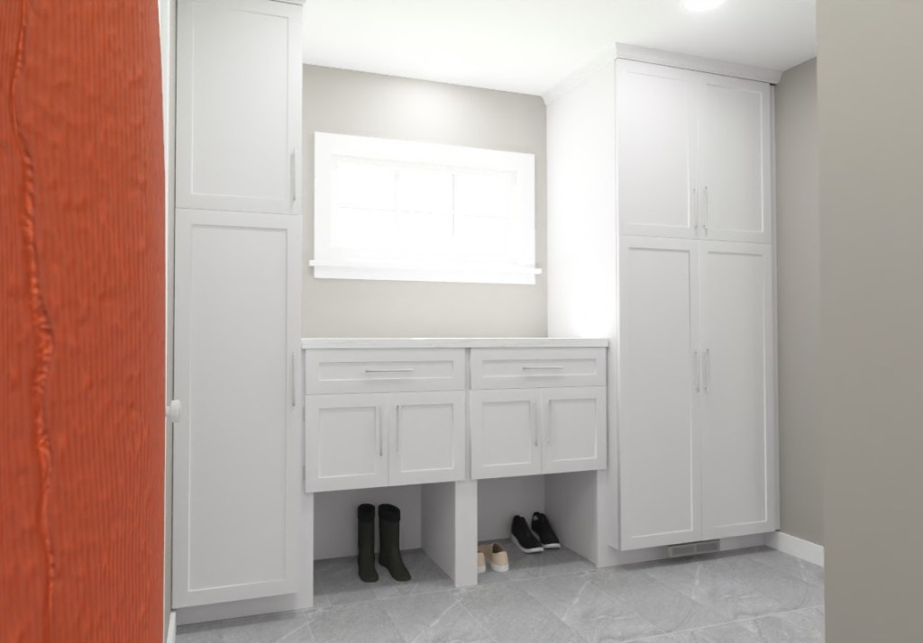 The new design provides ample storage and even some cubbies to tuck away shoes. There is still a countertop area for temporary items like bags of groceries. With the floor-to-ceiling cabinetry, homeowners should be able to tuck away extra appliances or supplies. In this room, we will remove the baseboard heating. We will install a high output kick space heater beneath the cabinetry.